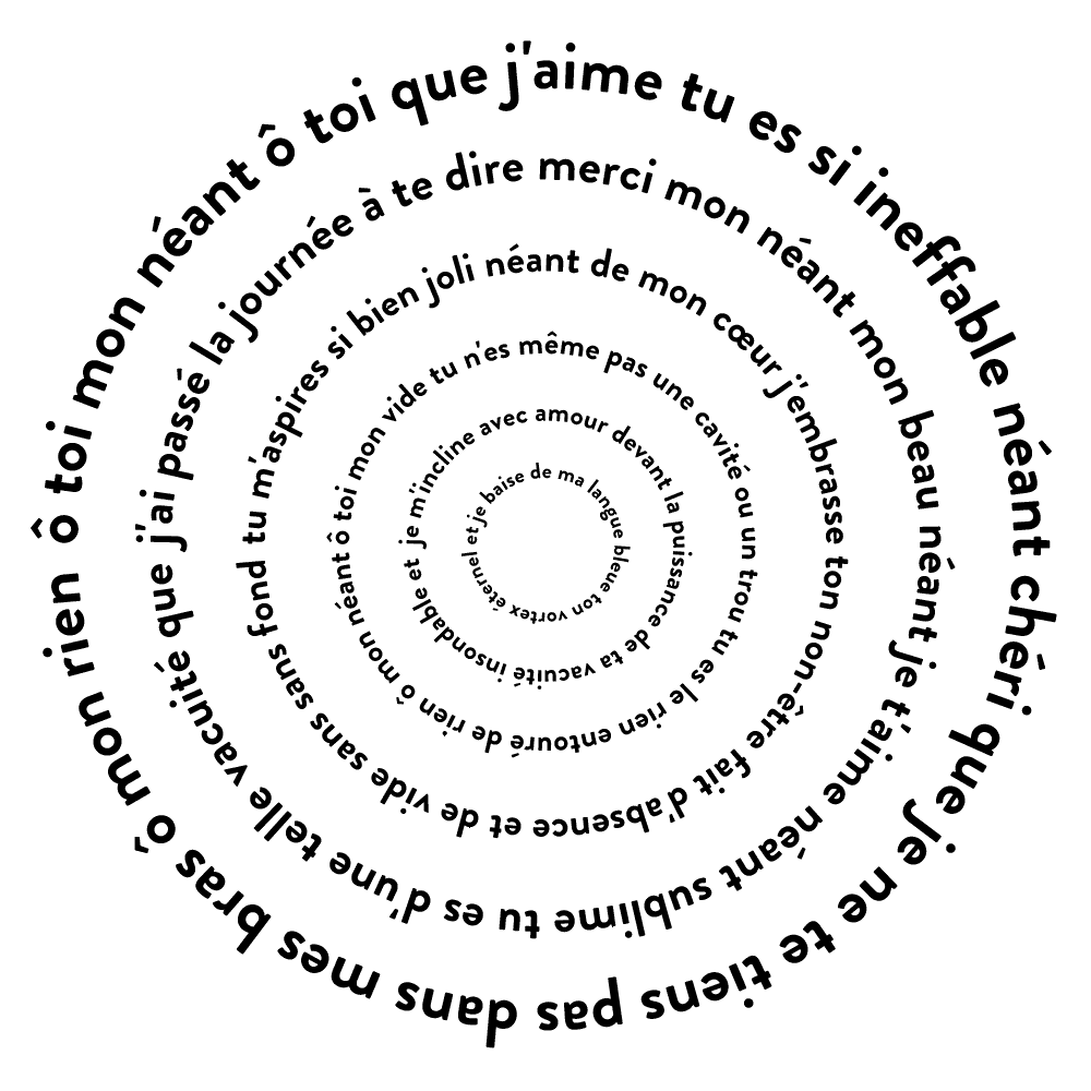 maintenant trêve de balivernes félicitations vous vous êtes rendus jusqu’ici bravo c’est signe que vous ne faites partie d’aucune élite comme moi qui suis protégée de la pluie spermeuse de mes grand-papas sordides je me la coule douce loin de la tyrannie des lexicographes ce qui me laisse le temps de m’épiler les dents et enfin contempler avec des yeux exempts de farines animales un avenir qui se veut radieux et rempli de joies simples comme transformer mon clitoris en cafetière c’est la fin de tout c’est la fin de tout c’est la fin de tout la saison des charniers est arrivée nous y enfouirons tout Disneyland nous y enfouirons la Pléiade et tout ce qui peut se déchiffrer et tout ce qui a l’audace de se présenter comme ayant un sens toutes les ordures que la culture nous a enfoncé dans le crâne c’est la fin de la littérature elle est morte depuis si longtemps c’est la fin de la poésie c’est la fin c’est la fin c’est la fin de la beauté molle des foires commerciales dansons loin des censeurs et des esthètes loin des savants et des critiques loin des vendeurs de rand social c’est la fin il n’y a plus rien à dire à part que j’aime lécher des klokfinisses.