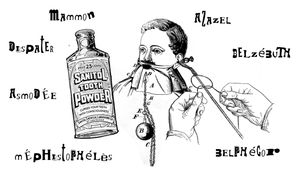 Avant tout, placez-vous devant un miroir, de façon à pouvoir constater si votre âme reste solidement attachée à votre mâchoire. Si une buée se forme à sa surface, c’est très mauvais signe; il y a de toute évidence aucune proposition contradictoire à unir dans une synthèse de brossage. Tenez fermement votre brosse, jusqu’à ce que vos jointures blanchissent et adoptent la teinte crémeuse d’une dentition impeccable. Puis, posez un peu de dentifrice fluoré sur vos sourcils, sans y ajouter d’eau, et récitez à voix basse les noms des sept princes des enfers: Mammon, Azazel, Belzébuth, Asmodée, Belphégor, Dispater et Méphistophélès.
